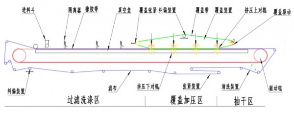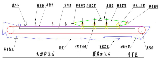 環形過濾膠帶由電機經減速驅動連續運行,濾布鋪敷在膠帶上與之同步運行。膠帶與真空室滑臺接觸(真空室與膠帶間有環形磨擦帶并通入水形成水密封),當真空室接通真空系統時,在膠帶上形成真空,料漿由布料器均勻地布在濾布上,在真空的作用下,濾液穿過濾布經膠帶上的橫溝槽匯總并由膠帶中心小孔進入真空室,固體顆粒被截留而形式濾餅;進入真空的液體經氣水分離器排出。隨著橡膠帶移動已形成的濾餅依次進入濾餅抽濾區、覆蓋區、抽干區;在上下濾布共同包裹下,形成高真空區域,抽出濾餅中的水分,同時在覆蓋區有擠壓輥與對輥,在氣缸高壓力線接觸作用下擠壓濾餅,去除濾餅水份;經過抽干區進一步脫水,濾布與膠帶分開,在卸濾餅輥處將濾餅卸出;卸除濾餅的濾布經清洗后獲得再生;再經過一組支承輥和糾偏裝置后重新進入過濾區。