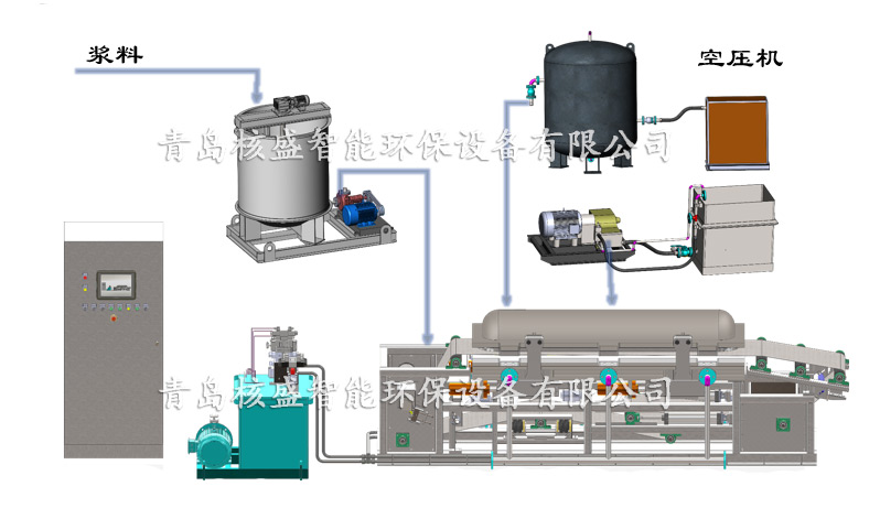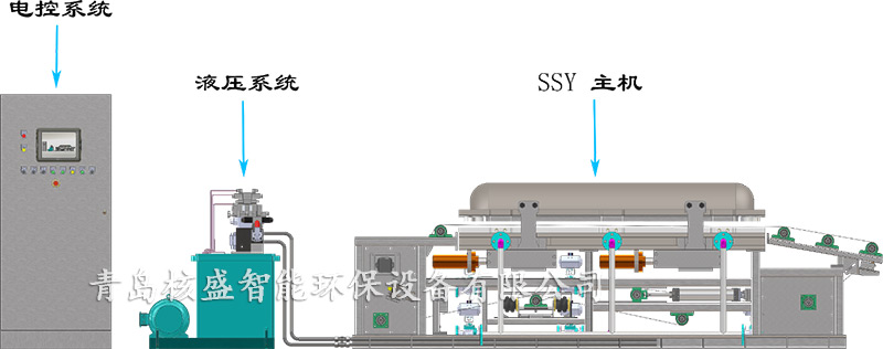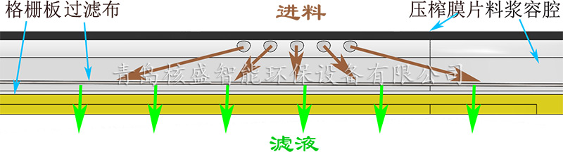 水平帶式加壓過濾機是一種新型過濾設備,設備工作時先閉合過濾室,物料經入料泵以一定壓力從入料孔進入過濾室,借助入料泵的給料壓力在過濾介質兩側形成的壓力差實現固液分離,物料被截留在濾層內,濾液透過濾布排出機外,經過一段時間后,濾液不再流出,過濾脫水過程完成,停止入料。然后進行高壓壓榨并用壓縮氣吹干濾餅;打開設備,驅動輥帶動過濾布行走,卸掉濾餅,高壓風瀑清洗濾布后進入下一個過濾循環。主要由主機、電氣控制系統、液壓控制系統、風干系統及給料系統組成。